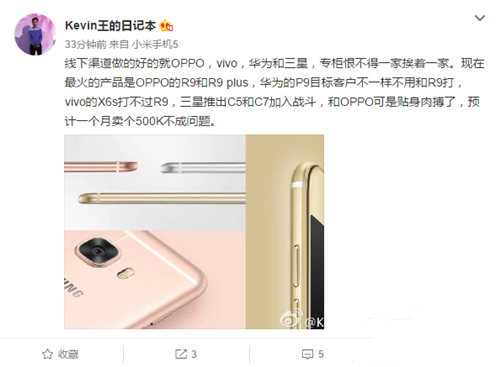 @Kevin王的日記本表示,目前線下渠道做的最好的是OPPO,vivo,華為和三星,其中華為和OPPO的目標(biāo)用戶不同,而vivo的X6s又不是R9的對手。