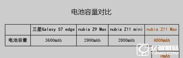 就硬件方面來說,nubia Z11 Max配備了一塊4000mAh大容量高密度電池(注:不可拆卸)。相比前作nubia Z9 Max,以及nubia Z11 mini都存在明顯優勢。這無疑是眾多努比亞粉絲所期待的。事實上,相比大屏手機三星Galaxy S7 edge,nubia Z11 Max的電池配置同樣具備優勢,如下圖所示。由此可見,努比亞滿滿的誠意。