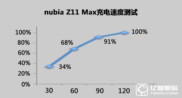 當然,低耗電量僅是一個方面,4000mAh大電池多久能夠完全充滿也是我們關注的點。事實上,nubia Z11 Max支持nubia快充3.0技術。經過測試,電量完全耗盡后,通過原裝充電器充電10分鐘,電量增至11%;充電30分鐘,電量增至34%;充電60分鐘,電量則增至68%;兩小時左右,則完全充滿。需要