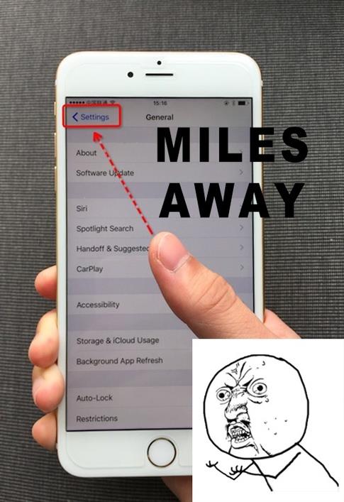 正如剛才所說,iPhone是否易用,永遠最多人吐槽的是“返回”按鈕(下圖):這個按鈕位于畫面的左上角,正好是我們拇指最難觸碰到的位置。