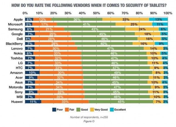 除了智能手機之外,Tech Pro Research的最新報告還涉及到平板設備的安全性排名,其中蘋果仍然是排名第一,剩下的十四名分別是(按前后順序):微軟、三星、谷歌、戴爾、黑莓、聯想、諾基亞、東芝、LG、HTC、亞馬遜、宏?、華碩、摩托羅拉、索尼、微星和華為。無論是哪份排名,蘋果無疑都是最大贏家。