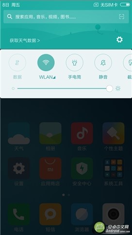 通知欄也有所改變,MIUI 8中不同模塊更為直觀的使用不同色調(diào)進行區(qū)分,快捷設(shè)置按鈕也增添了一種全新的排列形式,除了之前的列表模式,還有左右滑動的模式可供用戶選擇。