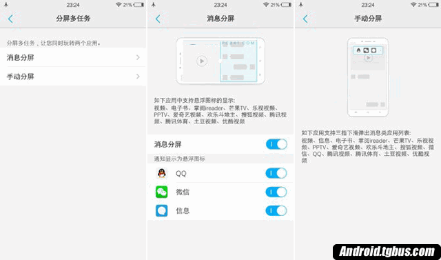第二、分屏任務(wù)的好處就是可以讓用戶同時使用兩個應(yīng)用,主要包含「消息分屏」和「手動分屏」2大功能。其中消息分屏,能夠讓視頻、電子書、芒果TV、騰訊視頻、優(yōu)酷視頻、土豆視頻等APP中,懸浮圖標(biāo)顯示QQ、微信、信息等應(yīng)用;而手動分屏,在支持在這些應(yīng)用中,三指下滑彈出消息。