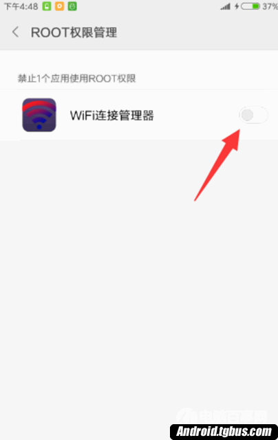 接著在“授權管理”界面中,點擊“ROOT權限管理”項,并在其授權界面中,開啟想要申請ROOT權限的應用,即可允許指定應用使用紅米Pro手機ROOT權限。
