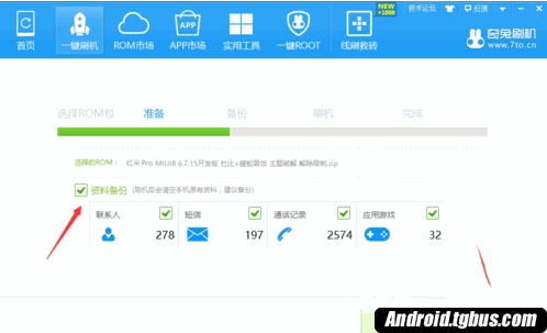 首先是驗證,驗證通過之后,便進入正式刷機過程,如圖所示,在此需要對手機重要數據資料進行備份操作,勾選想要備份的手機數據 ,點擊“開始刷機”操作。