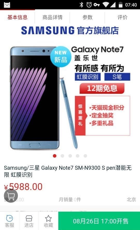 有網(wǎng)友發(fā)現(xiàn),三星天貓旗艦店商品頁面出現(xiàn)了Note 7國(guó)行的售價(jià)信息,其會(huì)在于8月26日下午17:00開售,64GB版本售價(jià)為5988元,比之前的預(yù)想貴了一些。