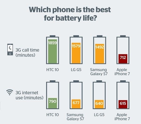 3G通話:HTC 10(1859分鐘)、LG G5(1579分鐘)、三星S7(1492分鐘)、iPhone 7(712分鐘);