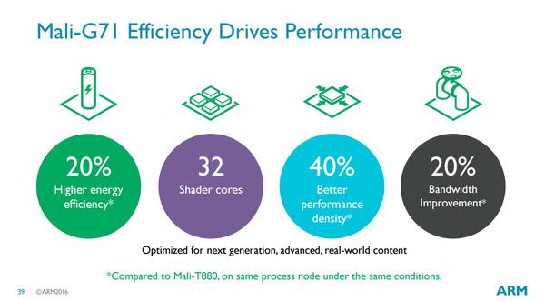 今年5月底,ARM發(fā)布新一代Mali-G71 GPU。在16nm FinFET制程下,主頻達(dá)到850MHz,三角形填充率850Mtri/s,像素填充率27.2Gpix/s。與Mali-T880相比,G71的能效比提升20%、性能提升40%。