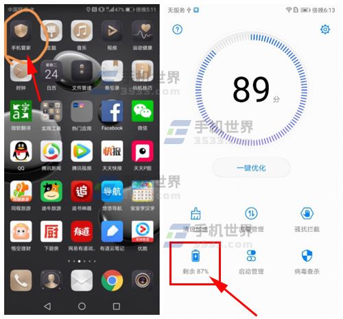 1)打開【手機管家】,點擊【剩余電量的電池圖標】;(如下圖)