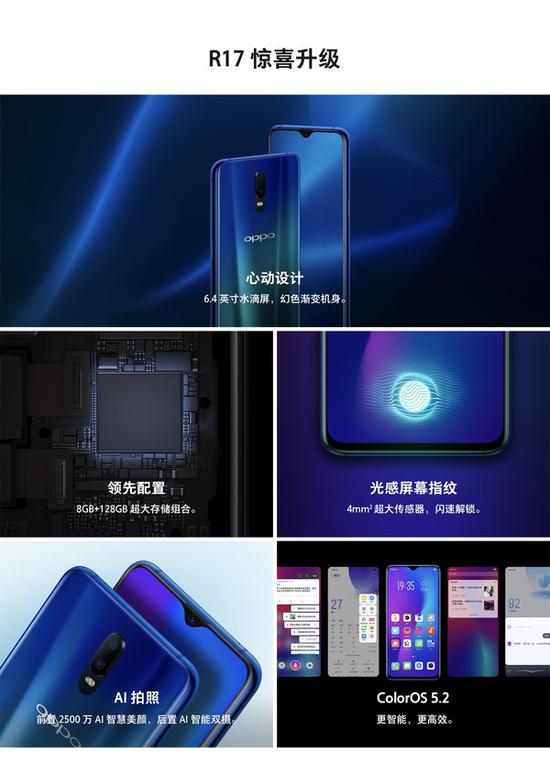 目前已知OPPO R17搭載6.4英寸水滴屏,配備光感屏幕指紋,內(nèi)置8GB+128GB內(nèi)存組合,前置2500萬(wàn)像素AI自拍鏡頭,運(yùn)行ColorOS 5.2系統(tǒng)。OPPO R17 Pro將后置三攝,其余配置應(yīng)該和R17相差不大。