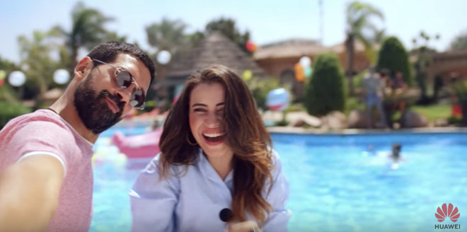 原來事情是這樣的,上述宣傳視頻中的女主角Sarah Elshamy在自己的Instagram上放出了一張拍攝時的幕后照片,男主角在展示新機的自拍,但是手中卻沒有手機,而是一旁的單反在進行拍攝。