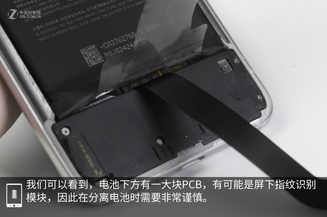 通過(guò)艱難的分離后蓋之后,就可以看到魅族16手機(jī)內(nèi)部結(jié)構(gòu)了,內(nèi)部為常見(jiàn)的三段式結(jié)構(gòu),防滾架背殼一側(cè)并無(wú)特別之處,因此我們感覺(jué)可能需要在屏幕一側(cè)再次開(kāi)蓋,看看屏下指紋模塊和散熱銅管的位置。