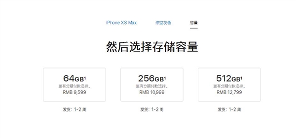 iPhone XS Max 64GB、256GB和512GB對應售價分別是9599元、10999元和12799元;