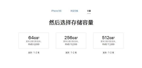 iPhone XS 64GB、256GB和512GB對應售價分別是8699元、10099元和11899元;