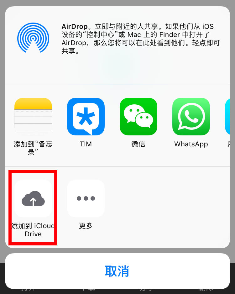 打開登陸百度網盤,在App內找到你想要設置鈴聲的音頻文件,點擊之后選擇下方的【打開】,并且【添加到iCloud Drive】