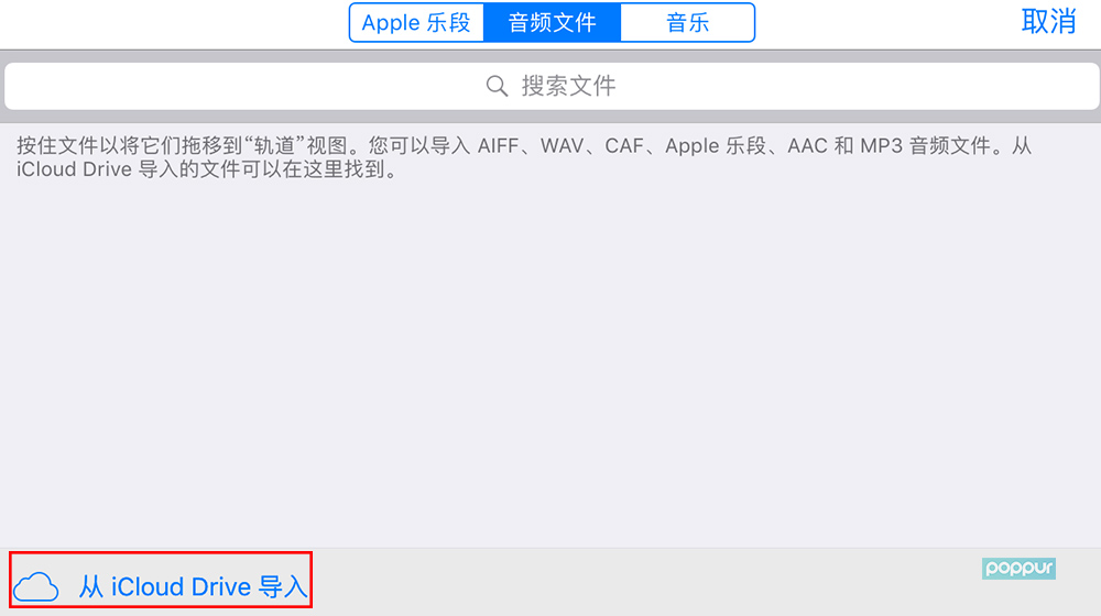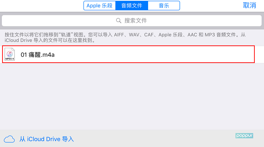 導入音頻文件時,選擇【從iCloud Drive導入】,找到第一步中分享的歌曲,長按并拖動到音軌的第一行。