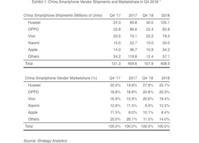此外,國產(chǎn)手機品牌繼續(xù)強勢,Strategy Analytics的數(shù)據(jù)顯示,華為2018年全年在中國智能手機出貨量為1.051億臺,緊隨其后的是OPPO、vivo和小米,其全年出貨量分別為8280萬臺、7930萬臺和5000萬臺。