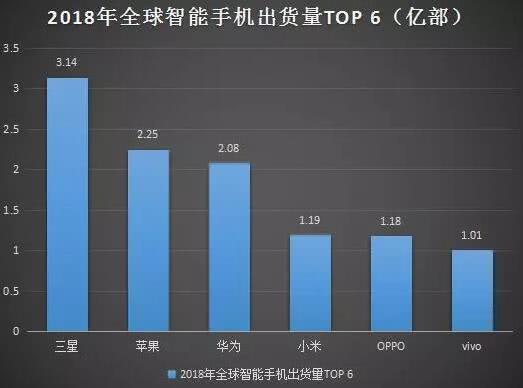 之前,國內(nèi)調(diào)研機構旭日大數(shù)據(jù)給出的2018年全年的各廠商智能手機的出貨量報告中顯示,三星、蘋果和華為依然是位列前三,而小米、OPPO和vivo分列四到六位,對應全年出貨量是1.19億部、1.18億部和1.01億部,也就是說目前全球前六大手機廠商智能手機出貨量都破億,具體來說如下: