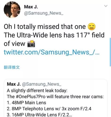 據此前消息,一加7旗艦本次將提供兩款,分別是一加7和一加7 Pro。據該爆料人透露,配置更高的一加7 Pro將后置三攝,其中主攝為4800萬像素,應該也會搭載索尼IMX586傳感器,此外還有一顆800萬像素長焦鏡頭(3倍光變、F/2.4)和一顆1600萬像素超廣角鏡頭(117度、F/2.2)。