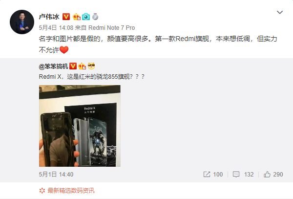 近日,有關(guān)Redmi驍龍855旗艦的消息頻頻曝光。此前,有微博數(shù)碼博主曬出一張疑似Redmi旗艦的真機(jī)諜照,背后海報(bào)顯示,該機(jī)命名為Redmi X。不過,Redmi總經(jīng)理盧偉冰隨即進(jìn)行了辟謠:“名字和圖片都是假的,顏值要高很多。第一款Redmi旗艦,本來想低調(diào),但實(shí)力不允許。”
