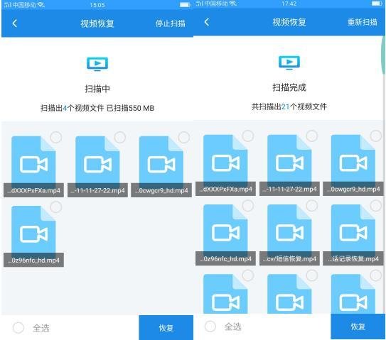 選擇之后,系統會進入自動掃描的頁面,等待片刻之后就可以看到被刪除的視頻、音頻信息了,選擇需要恢復的,確認恢復就可以啦。