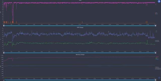 從性能狗Perfdog給出的測試數據來看,華為nova7 Pro在運行王者榮耀時有著很不錯的表現,在接近20分鐘的游戲中,幀率一直維持在60幀上下,偶爾浮動但是變化不大,即便是在大型團戰時也沒有過于明顯的撥動。CPU和內存的使用率也都保持在相對平穩的狀態,整體表現非常出色。
