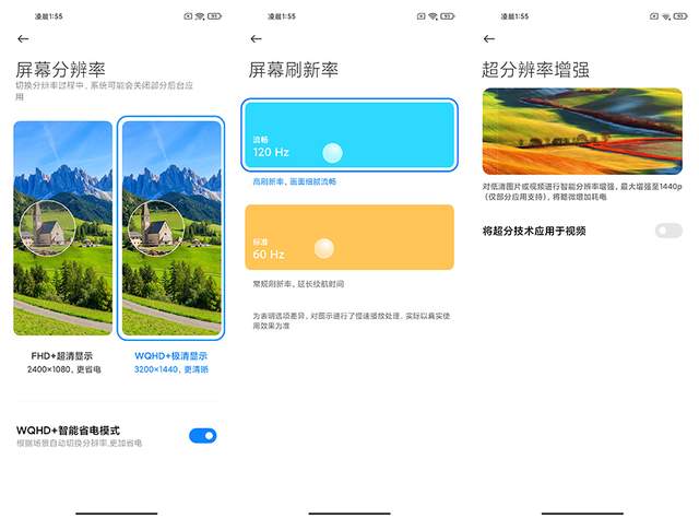 小米11有更好的屏幕和音效加持,比如屏幕除了120Hz刷新率之外還包括MEMC動態視覺補償,這不光體現在游戲上。實際還有超分辨率技術,比如一些低清晰度的視頻和圖片會被系統強化到1440p。