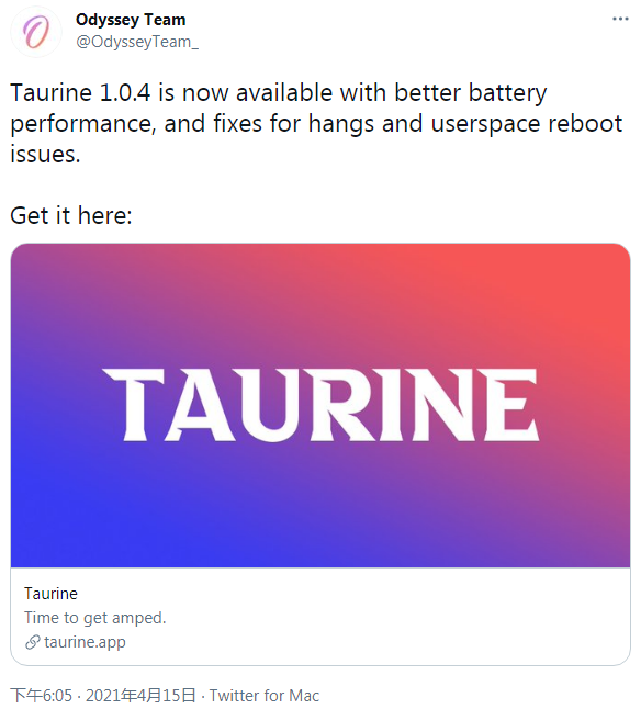 通常情況下,蘋果會(huì)在新版 iOS 發(fā)布后的一周后停用舊版簽名。但是對于想要越獄的用戶來說,目前尚無工具來破解 iOS 14.4.x 。Unc0ver 和 Taurine 的方案僅支持 iOS 14 ~ 14.3,但開發(fā)者仍在不斷更新以提升穩(wěn)定性和性能表現(xiàn)。最新消息是,Odyssey 團(tuán)隊(duì)發(fā)布了 Taurine 越獄的新改進(jìn)。在版本號升至 1.0.4 的同時(shí),還帶來了嚴(yán)重 Bug 的修復(fù)和電池續(xù)航改進(jìn)。