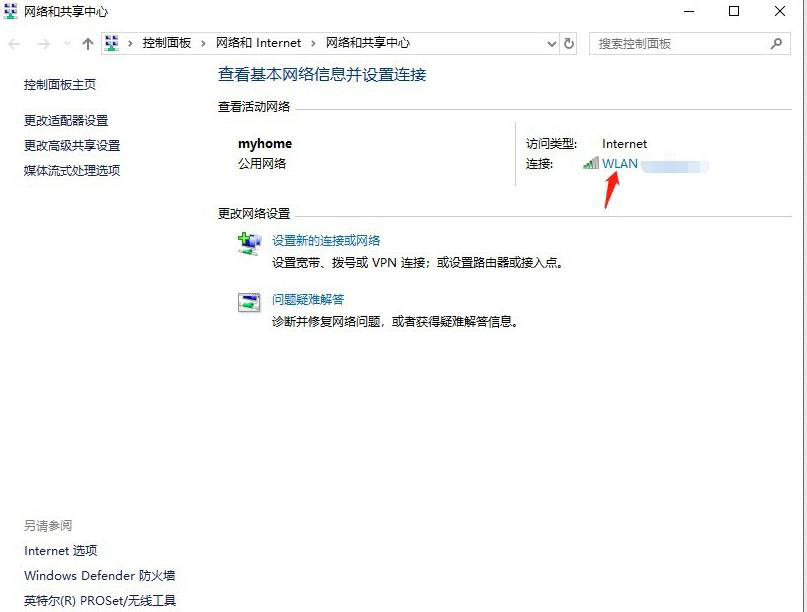 1、控制面板-網絡和 Internet-網絡和共享中心,點擊WLAN
