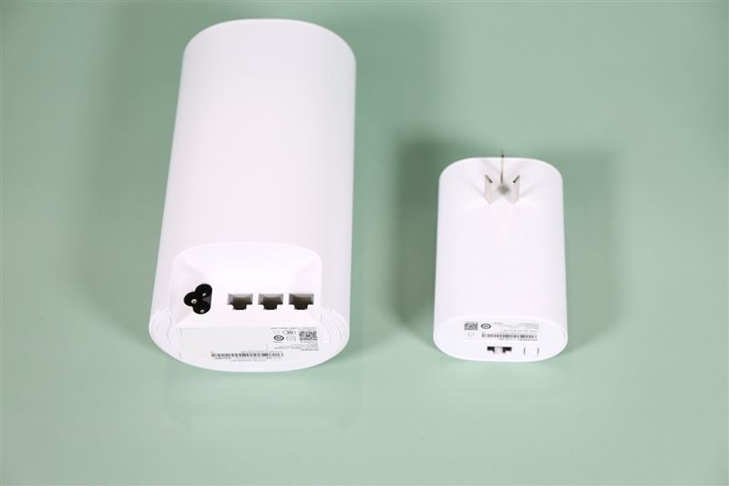 華為路由Q2S采用的是子母式的設計,皆為橢圓形的外形,主路由體積稍大,子路由體積更為小巧。