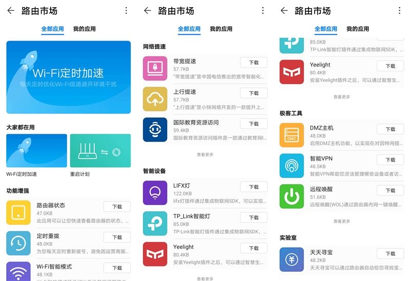 配置連接則非常簡單,只用輸入一次管理員密碼和Wi-Fi密碼,就會自動完成配置流程。無論是網頁管理界面還是手機APP端的管理界面,功能設置都十分齊全。尤其是手機端還提供了一個路由市場,里面提供了定時重撥、智能VPN等功能插件。