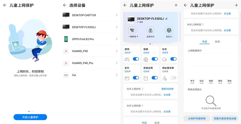 細看智慧生活中的功能,其中也不乏一些非常有用的小工具。比如兒童上網功能,對于家庭使用來說,就十分的重要。選擇設備,可以在游戲、視頻、社交、支付等選項中選擇允許或禁止的操作,一鍵斷網、數據統計也很好的方便了控制和了解孩子上網情況。