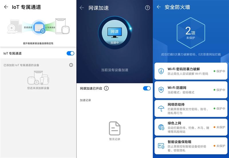 除了兒童上網保護外,這樣方便的功能在智慧生活APP中還有不少。比如IoT專用通道,可以改善家中智能家居與路由器的連接、網課加速,十分貼合當下家庭的需要等等。