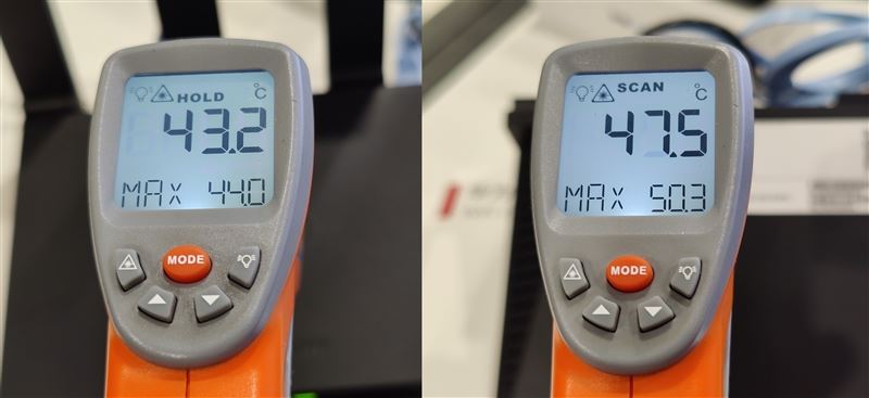 溫度方面,華為路由AX3 Pro路由器需要需要注意配合良好的通風散熱,正面僅Hi-Link按鍵附近微微發熱,整體與室溫一致。底面溫度則高一些,并且由于墊腳較低,所以發熱面積較大。