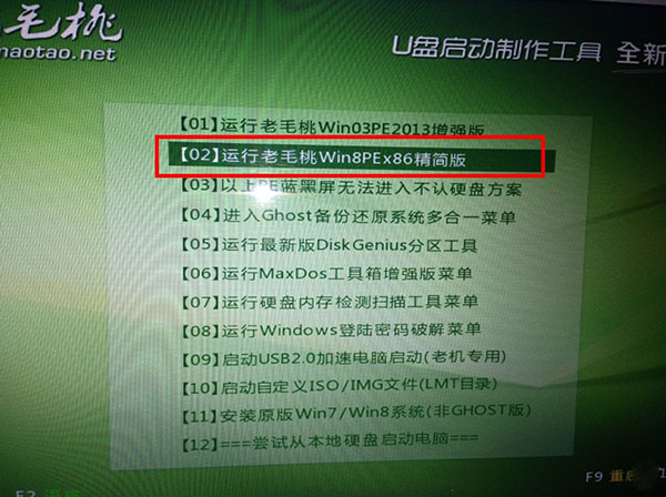 接下來會進入到菜單選項,如下圖,選擇第2個,“運行老毛桃Win8PE x 86精簡版” 。