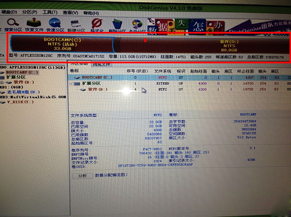 根據你自己的需要對硬盤進行分區,格式建議還是選擇NTFS格式,以后會省去很多的麻煩!由于我的是120的AIR,所以我只是分了兩個區,一個33,一個80,如果你是500的MACBOOK PRO,那就可以多分兩個區了。