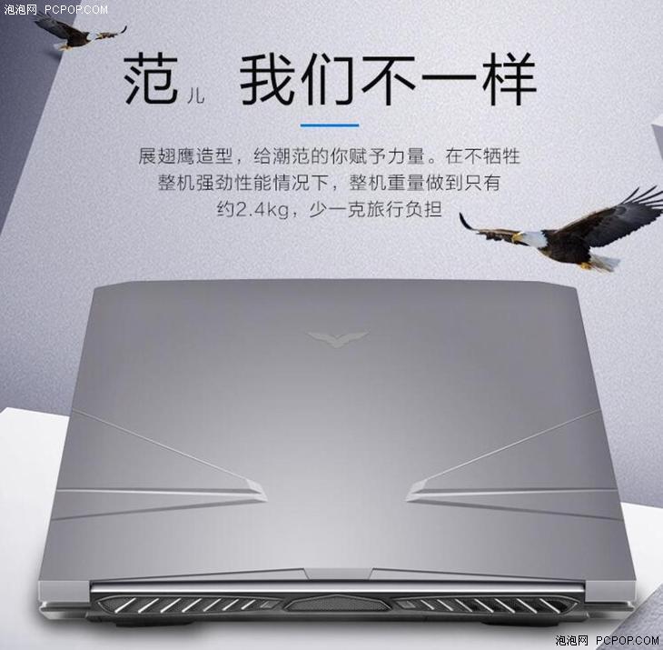海爾凌越GT 15.6英寸的機身A面正中央也有一個LOGO,兩側加以翼狀紋理,從A面的設計來看,更多像是游戲風格的主題。從這張圖中可以看到,筆記本采用了后置出風的設計。筆記本重量為2.4kg,對于一款游戲本來說,有著不錯的便攜性。