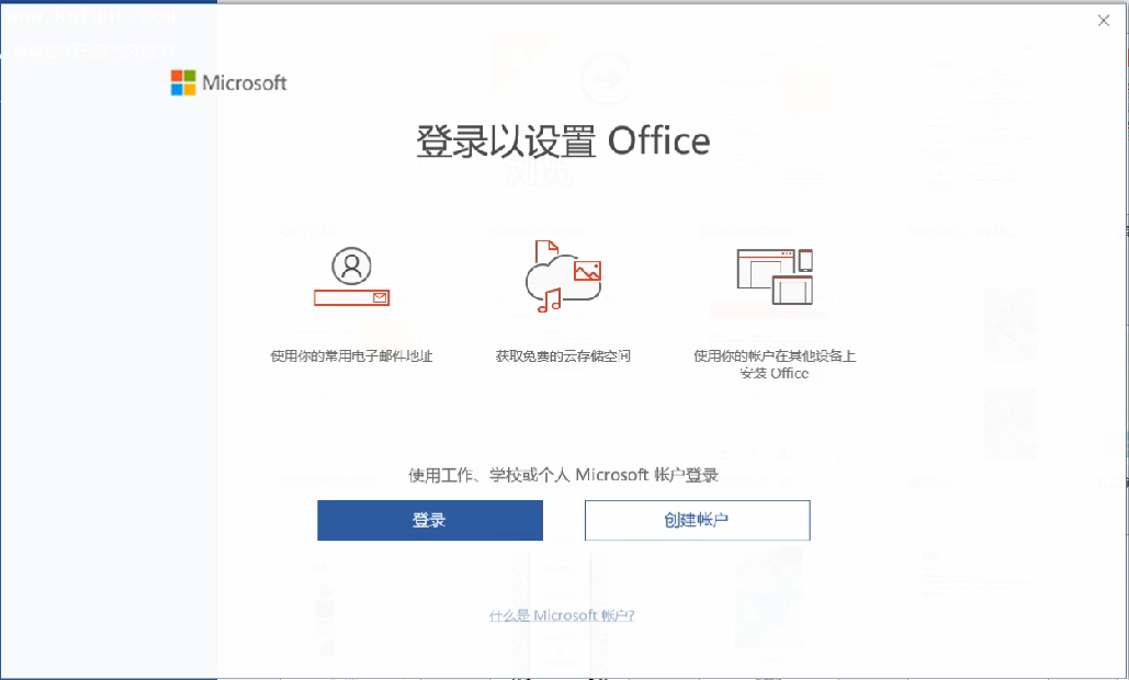 2. 打開應(yīng)用后,會彈出“登錄以設(shè)置Office”界面,如果您有微軟帳戶,點(diǎn)擊“登錄”;如果沒有微軟帳戶,點(diǎn)擊“創(chuàng)建帳戶”并按照提示注冊一個(gè)。