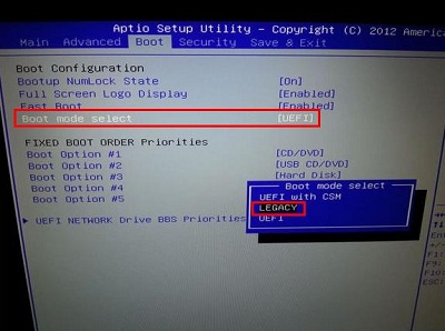 3、接下來,通過上下方向鍵將光標移至“Boot mode select”選項,按Enter鍵即可打開啟動模式設置窗口,我們只需選擇“legacy”,接著按Enter鍵確認即可,如下圖所示: