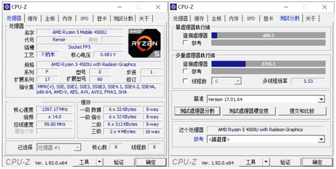 在CPU-Z測試中,銳龍5 4500U的單線程分數為489,多線程分數為2705。這個成績已經超過了Intel桌面處理器i5-9400F的481、2685,在性能上可以一較高低。