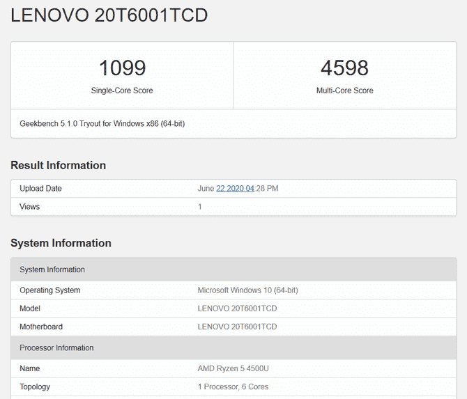 在GeekBench 5.1.0的測試中,銳龍5 4500U在這款筆記本上的得分,多線程達到了4598,單線程為1099,表現相當不錯。