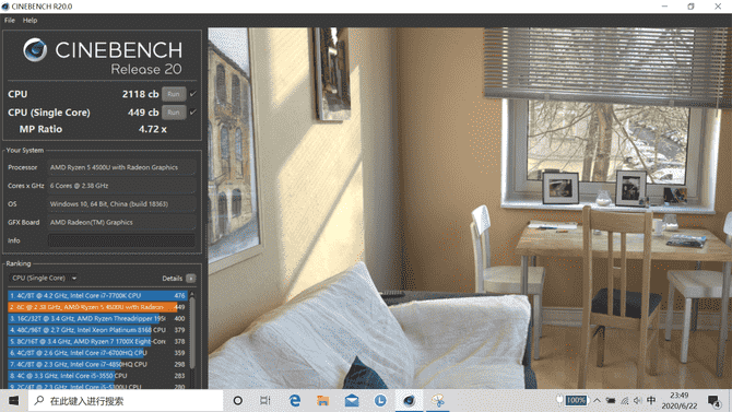 Cinebench R20同樣更加專注CPU性能的測試,最終的得分多核2118cb,單核得分449cb。這樣的成績足以應付日常使用,游戲甚至是諸如照片編輯之類的繁重任務。