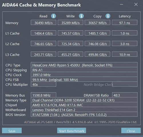 搭載銳龍4000系列處理器的筆記本產品,今年普遍將內存升級到DDR4 3200MHz規格,并且在容量上也翻了一倍,這不僅能夠讓CPU性能得到好發揮,在系統、程序、多任務處理等方面,都起到重要作用。這款ThinkPad E14銳龍版筆記本搭載了16GB雙通道內存,在AIDA 64內存測試中,讀取速度36490MB/s,寫入速度35289MB/s,達到了中高端水平。