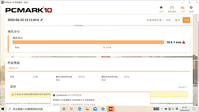 7nm銳龍4000系列處理器之所以能夠在移動端同樣取得更好的成績,除了性能,在功耗方面的優化也有利于續航時間的提升,這款筆記本內置的鋰電,在現代辦公模擬環境下,支持長達近10小時的續航。