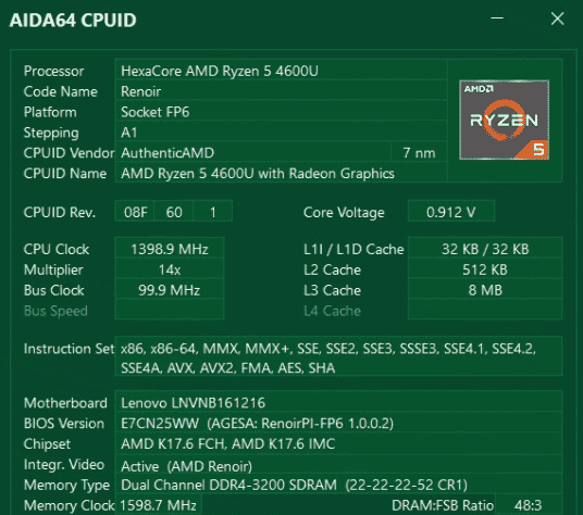 該機搭載的這顆Ryzen 5 4600U移動處理器采用7nm制程,基于ZEN2架構打造,6核/12線程設計,基準頻率2.1GHz,動態(tài)擴頻可達4.0GHz,TDP僅有15W。