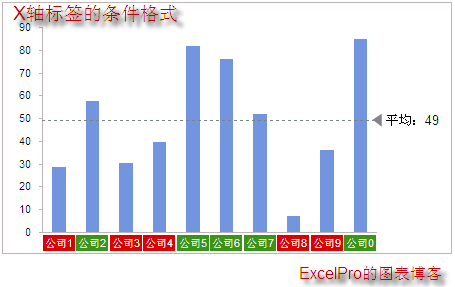 X軸的分類標簽本身無法設置條件格式,這一技巧不過是用輔助序列模擬罷了。下圖中,高于平均線(或其他閥值)的X軸標簽顯示為綠色,低于的顯示為紅色。