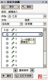 4、選中上述插入的圖片,執(zhí)行“幻燈片放映→自定義動畫”命令,展開“自定義動畫片”任務(wù)窗格(如圖二)。