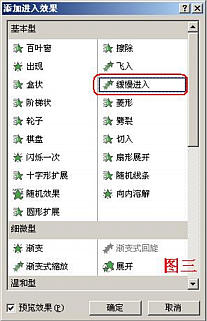 單擊“添加效果”右側(cè)的下拉按鈕,在隨后出現(xiàn)的下拉列表中,展開“進入”下面的級聯(lián)菜單,選中其中的“其他效果”選項,打開“添加進入效果”對話框(如圖三),再選中其中的“緩慢進入”選項,“確定”返回。