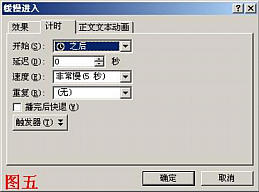 8、在“任務(wù)窗格”中雙擊第二張圖片的動畫設(shè)置選項,打開“緩慢進入”對話框(如圖五),切換到“計時”標(biāo)簽下,按“開始”右側(cè)的下拉按鈕,在隨后出現(xiàn)的下拉列表中,選擇“之后”選項,并將下面的“延遲”選項設(shè)置為“0”。