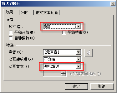 然后再次點(diǎn)擊“添加效果→強(qiáng)調(diào)→放大/縮小”,完成后雙擊動(dòng)畫(huà)列表中的“放大/縮小”項(xiàng),在設(shè)置面板中注意將“尺寸”由默認(rèn)的“150%”改為“50%”或其它合適的比例,將“動(dòng)畫(huà)文本”項(xiàng)由默認(rèn)的“按字母”改為“整批發(fā)送”(圖2)。